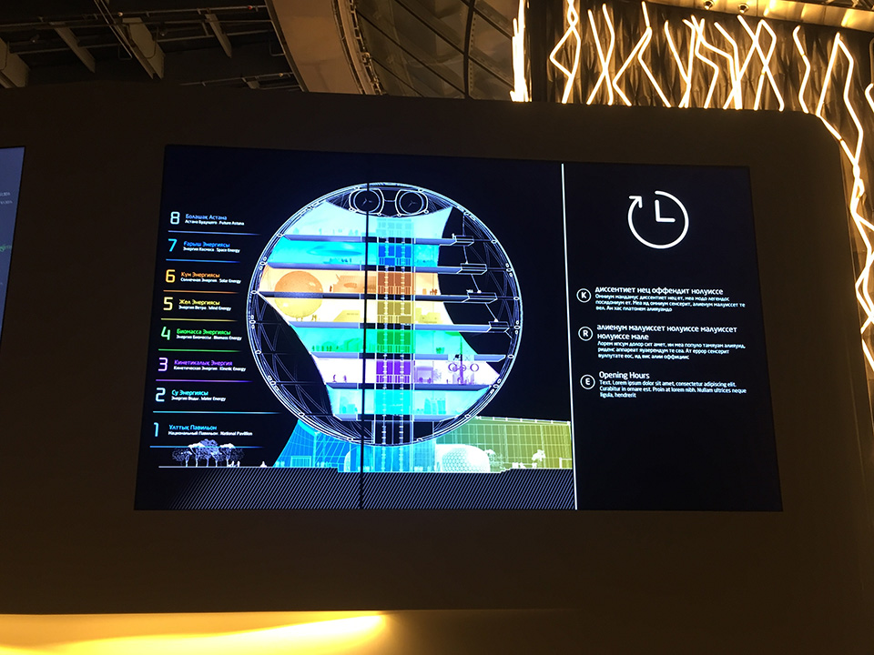 It consists of 2 videowalls formed by 6 screens in total and is located at the information desk at the entrance of the Pavilion.