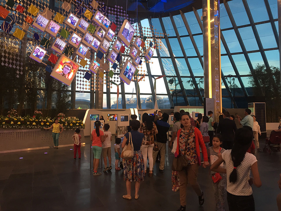 United Under One Sky is an interactive audiovisual installation that allows visitors to take portraits of themselves and to be characterized as professionals of the future. Then, those portraits appear on a huge videowall above.