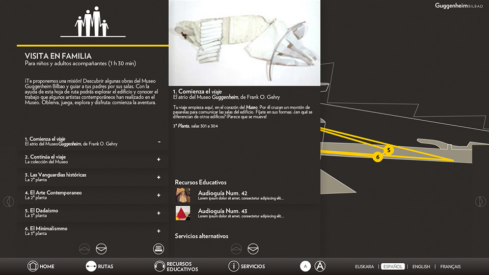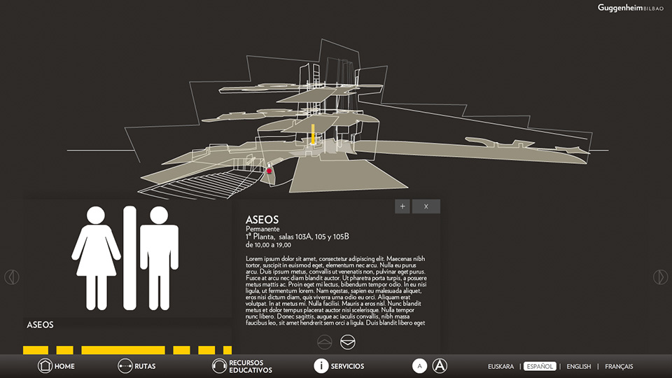 Show the most recent events: Exhibitions, Museum Services, Predefined Routes and Educational Resources. Each element is displayed on a tab that shows complete information of each event, as well as relationships with other events. On a map of the Museum, the specific location of each event is shown, and can be completed with virtual visits.