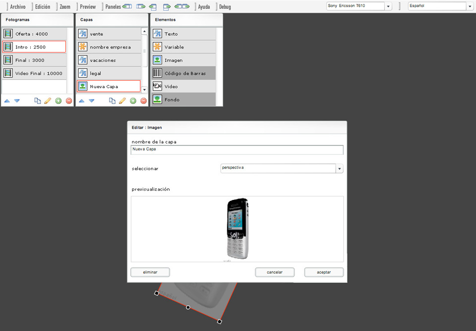 The application allows a single label design valid for several products, which can be edited in real-time. Each label consists of one or more frames, containing texts, images, videos, barcodes or formatted variables.