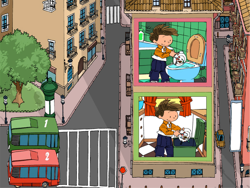 This game consisted of a multimedia piece with animations in which two groups of several students played together answering questions about recycling.